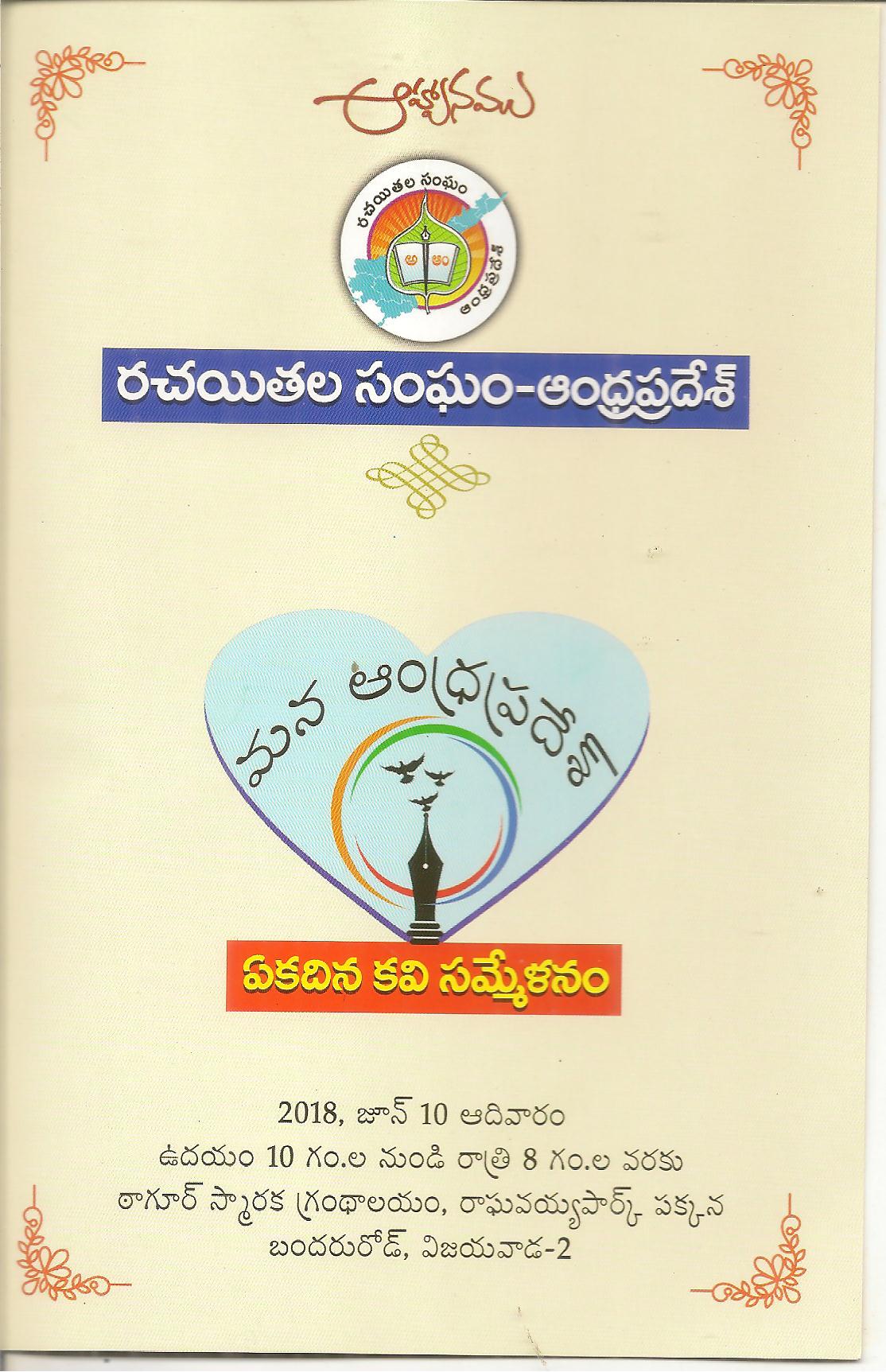 ← ఆం .ప్ర .ర. సంఘం ఆధ్వర్యం లో ఈనెల 10 ఆదివారం ఆంధ్రప్రదేశ్ పై ”ఏకదిన కవిసమ్మేళనం ”ఆహ్వానపత్రిక