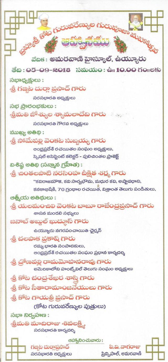 -సెప్టెంబర్ 5 ఉపాధ్యాయ దినోత్సవాన్ని సుమారు 7 దశాబ్దాల క్రితం శ్రీ మైనేనిగారికి, నాకు ప్రాధమిక విద్య బోధించిన ”స్వర్గీయ బ్రహ్మశ్రీ కోట సూర్య నారాయణ శాస్త్రి గురువరేణ్యులగురుపూజోత్సవం ”గా 5-9-18 బుధవారం ఉదయం 10 గంటలకు స్థానిక అమరవాణి హైస్కూల్ లో సరసభారతి ,132 వ కార్యక్రమంగా ఆపాఠశాలతో కలిసి సంయుక్తంగా నిర్వహిస్తున్నాము ..గురుపుత్రులు ,,ప్రముఖ అతిధులు పాల్గొనే ఈ కార్యక్రమానికి అందరూ ఆహ్వానితులే .విచ్చేసి జయప్రదం చేయ ప్రార్ధన .