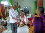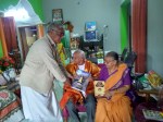 అప్పటికే వారి అర్ధాంగి అన్నీ సిద్ధం చేసి ఉంచారు .నేను హైదరాబాద్ లొ ఉన్న శ్రీ అందుకూరి శాస్త్రిగారికి ఫోన్ చేసి కోరిడే వారి సంస్థానం లొ ఉన్నామని చెప్పాను .వారెంతో సంతోషించి వీరి తండ్రిగారున్నప్పుడు ధర్మపురి వచ్చి వారి ఆతిధ్యం పొందిన విషయం జ్ఞాపకం చేసుకొన్నారు .శర్మగారితో శాస్త్రి గారు మాట్లాడారు .పప్పు ,బీన్స్ కూర ,అరటి వేపుడు, కాబేజికూర , శ్రీకంఠ్ స్వీటు ,చారు ,పెరుగులతో కమ్మని తృప్తికరమైన భోజనం పెట్టారు .అందరం మెచ్చుకొంటూ తిని ధన్యవాదాలు చెప్పాం .83ఏళ్ళ శర్మగారి మాత్రుమూర్తి గారిని పలకరించి నమస్కరింఛి ఆశీస్సులు పొందాం .అందరి భోజనాలయ్యాక శ్రీ శర్మగారినీ ,విదుషీమణి శిష్యురాలు అయిన వారి అర్ధాంగి గారినీ కూర్చోపెట్టి హైదరాబాద్ లోకొన్న పంచ ఖండువా వారికి కప్పి ,చీర జాకెట్ ఆమెకు అందించి సరసభారతి పుస్తకాలు ‘’షార్లెట్ సాహితీ మైత్రీ బంధం’’ ,’’వసుధైక కుటుంబం కవితా సంకలనం ‘’పండ్లతో సహా అందజేసి ఆశీర్వాదాలు పొందాం .ఉత్తరాదిలాగా ఇక్కడ వీరికి ఆశ్వయుజ పౌర్ణమి నుంచే కార్తీకం ప్రారంభమవుతుందట .అందుకే ఈ పౌర్ణమిమినాడే పురాణం చెప్పటం మొదలు పెట్టారట .శర్మగారి దంపతులు నాకు చాల ఖరీదైన శాలువాకప్పి మా శ్రీమతికి కోడలికి జాకెట్ ముక్కలు మాబ్బాయికి తువ్వాల ,తాము రాసిన ‘’శ్రీ వేద వ్యాస కృత ‘’గౌతమీ మహాత్మ్యం ‘’-శ్రీ బ్రహ్మాండ పురాణా౦త ర్గతం’’ అనే విస్తృత గ్రంధాన్ని(దీనినే శర్మగారు ప్రస్తుతం పురాణంగా చెబుతున్నారు ) ,తమ తండ్రిగారు డా కోరిడే రాజన్న శాస్త్రి గారు రచించిన ‘’ధ్వని –మనుచరిత్రం ‘’అనే అపురూప రిసెర్చ్ గ్రంథాన్నీ అందజేశారు . ఆన౦దంగా స్వీకరించాము .సరసభారతి పురోగతి అడిగి తెలుసుకొన్నారు .తన ఇంట్లో తమకు సన్మానం ఏమిటన్నారు?’’ఇది సరసభారతి సత్కారం పండిత సన్మానం ‘’అని చెప్పాను . .దారిలో కనపడినవారందరికీ నన్ను గురించి చాలా పెదపెద్ద మాటలతో చెప్పి నేను సిగ్గుపడేట్లు చేశారు . వారింటికి వెళ్ళేదారిలో రెండు పుష్కరిణులు ఉంటే వాటి విశేషాలు తెలిపారు .ఇక్కడ స్వామివారి తెప్పోత్సవం డోలోత్సవం జరుగుతాయట .మొదటి దానిలోకి బయట ఎక్కడో ఉన్న చెరువు నీరు ఒక చిన్న రంధ్రం ద్వారా చేరి నిండి ,రెండవ దానిలోకి చేరుతుంది .వరదలు వస్తే వీటిలోని నీరు ఊళ్లోకి వచ్చి మునిగిపోకుండా అడుగున ఉన్న ద్వారం ద్వారా గోదావరిలోకి చేరుతుందట .ఇంతగొప్ప ప్రణాళికతో సుమారు రండు వేలసంవత్సరాలక్రితం ఈ పుష్కరిణులు ఏర్పాటయ్యాయట. మేము హైదరాబాద్ నుంచి వచ్చే దారిలో రాయపట్నానికి దగ్గర ఒకప్పుడు బౌద్ధ ఆచార్యుడు , గొప్ప బౌద్ధగ్రంథకర్త ‘’దిగ్నాగుడు ‘’నివసించిన ఊరు ఉన్నదని చెప్పారు