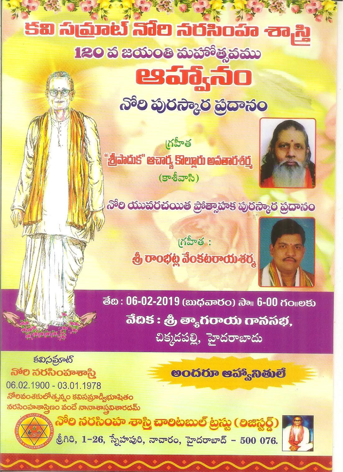 ← కవి సామ్రాట్ నోరి నరసింహ శాస్త్రి గారి ౧౨౦వ జయంతి మహోత్సవ ఆహ్వానం -6-2-19 సా 6-త్యాగరాజ గాన సభ -హైదరాబాద్