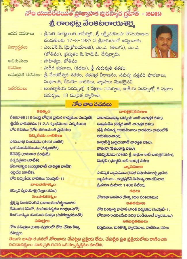 ← కవి సామ్రాట్ నోరి నరసింహ శాస్త్రి గారి ౧౨౦వ జయంతి మహోత్సవ ఆహ్వానం -6-2-19 సా 6-త్యాగరాజ గాన సభ -హైదరాబాద్