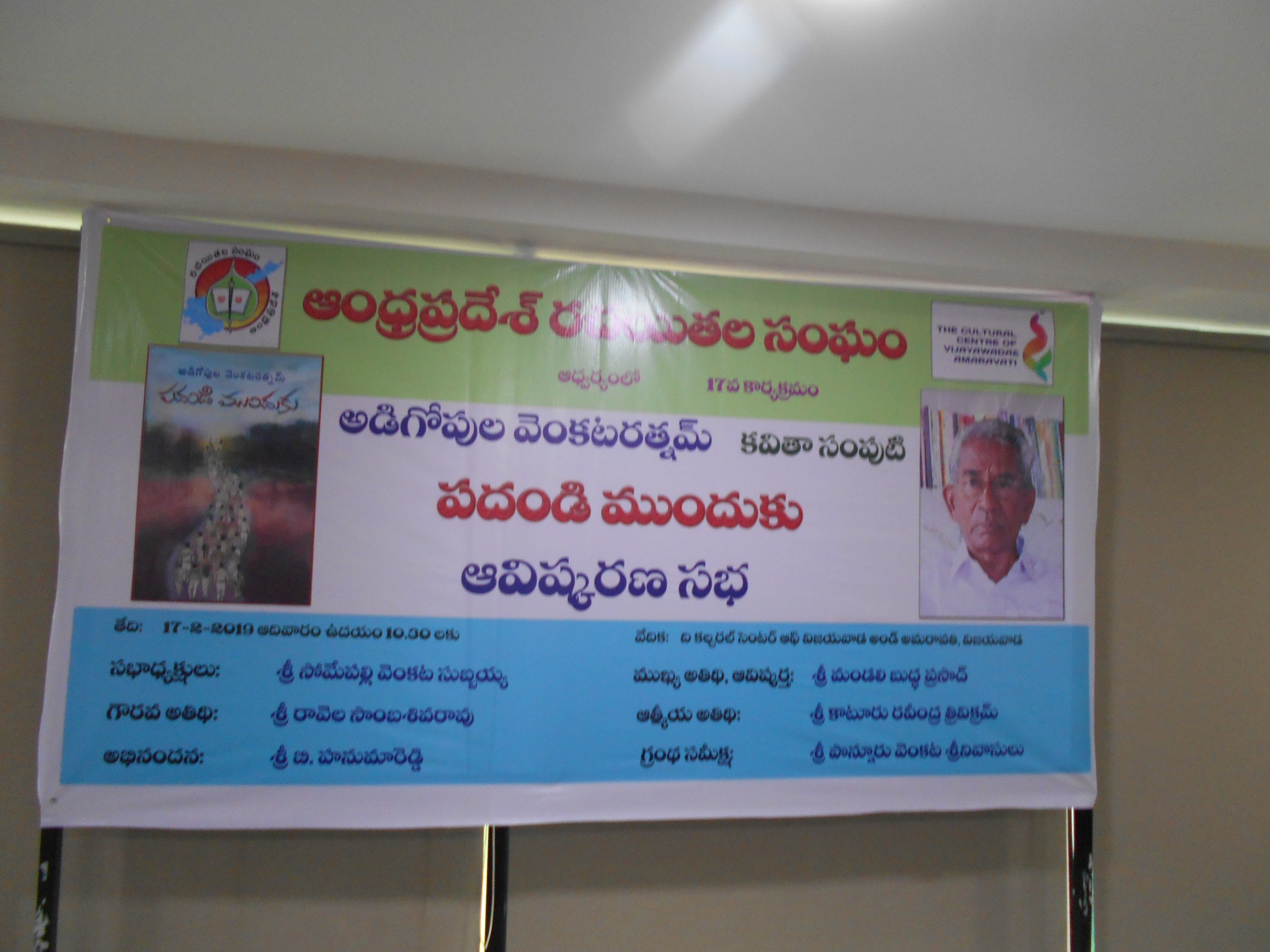 ← 17-2-19ఆదివారం ఉదయం విజయవాడ మొగల్రాజపురం మధుమాలక్ష్మి ఫంక్షన్ హాల్ లో శ్రీ అడిగోపుల వెంకటరత్నం గారి 24వ కవితా సంపుటి ”పదండి ముందుకు ”ఆవిష్కరణ