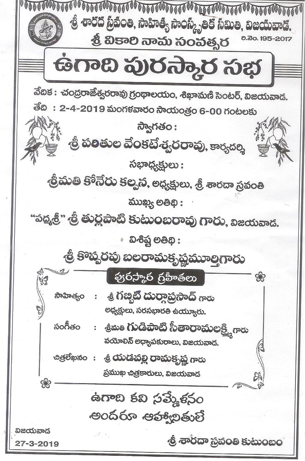 ← విజయవాడ శారదా శ్రవంతి ఉగాది సాహితీ పురస్కారం -2-4-19 -మంగళవారం సా యంత్రం 6 గంటలు