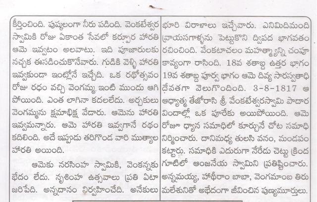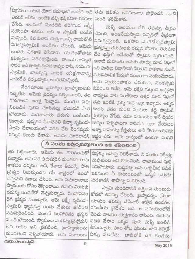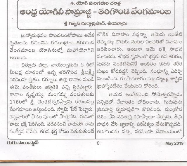 నేను రాసిన ”సిద్ధయోగిపుంగవులు ”పుస్తకం లోని ”ఆంద్ర యోగినీ సామ్రాజ్ఞి తరిగొండ వెంగమాంబ ”గురు సాయిస్తాన్ మే సంచికలో పునర్ముద్రితం -దుర్గాప్రసాద్