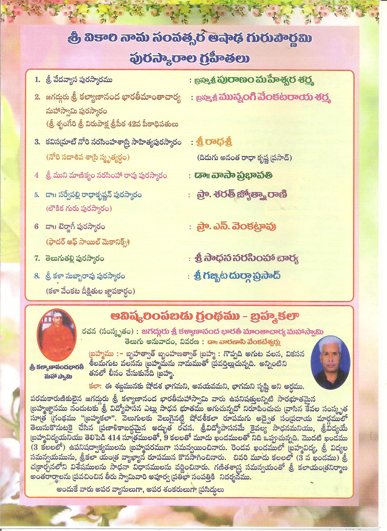 ← గురు పౌర్ణమి సందర్భంగా గురు పురస్కారంగా 14-7-19 ఆదివారం -సాయంత్రం 6గం .లకు లకు హైదరాబాద్ త్యాగరాజ గాన సభలో నోరి చారిటబుల్ ట్రస్ట్ అందించే కళాసుబ్బారావు అవార్డు