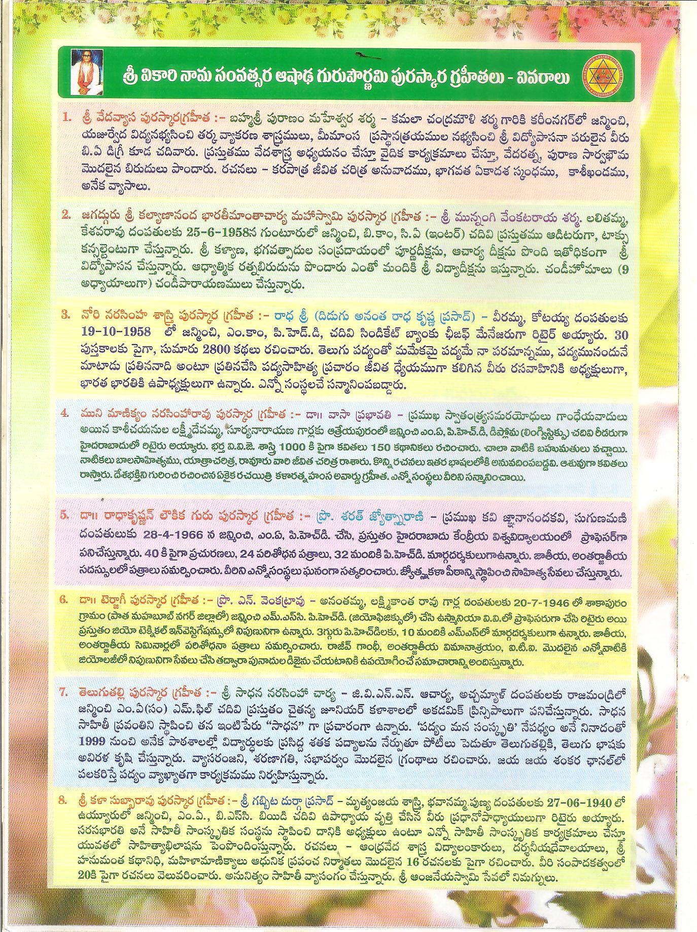 ← గురు పౌర్ణమి సందర్భంగా గురు పురస్కారంగా 14-7-19 ఆదివారం -సాయంత్రం 6గం .లకు లకు హైదరాబాద్ త్యాగరాజ గాన సభలో నోరి చారిటబుల్ ట్రస్ట్ అందించే కళాసుబ్బారావు అవార్డు
