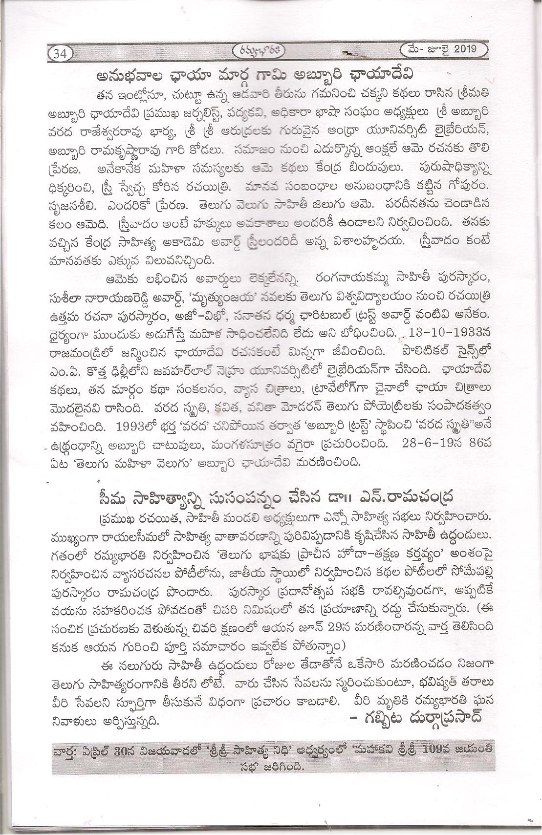 ← జులై రమ్యభారతి మాసపత్రికలో శ్రీ రామతీర్థ శ్రీ మహాస్వప్న ,శ్రీమతి అబ్బూరి ఛాయాదేవి గార్లపై నా వ్యాసం