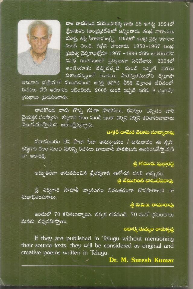 ఇన్ని అద్భుతఆంగ్ల కవితలను తెలుగులో బంగారపు పోత పోసి అందించిన రాచకొండ శర్మగారికి ఆంద్ర సాహితీ లోకం ఎంతో రుణపడి ఉంది .ప్రతికవిత ఆకవి హృదయాన్ని ఆవిష్కరించే తీరులో అనువాదం సాగి అనుభూతి నిచ్చింది .ఇన్ని హృదయాలలో పరకాయ ప్రవేశం చేయటం మాటలుకాదు .చేసి చూపించి తమ సమర్ధత చాటారు డా.శర్మగారు .మిక్కిలి అభిన౦దనీయులు .వారి పూనిక ధైర్యం దీక్ష ,నిరంతర సాహితీ సేవ అందరికీ ఆదర్శం .భగవంతుడు వారికి, వారి శ్రీమతిగారికీ శతాధిక ఆయుస్సు ,ఆరోగ్యం కలిగించాలని ,మరిన్ని అందమైన ఆంగ్లకవితల అనువాదాలు వారి లేఖిని నుండి వెలువడాలని కోరుతున్నాను .