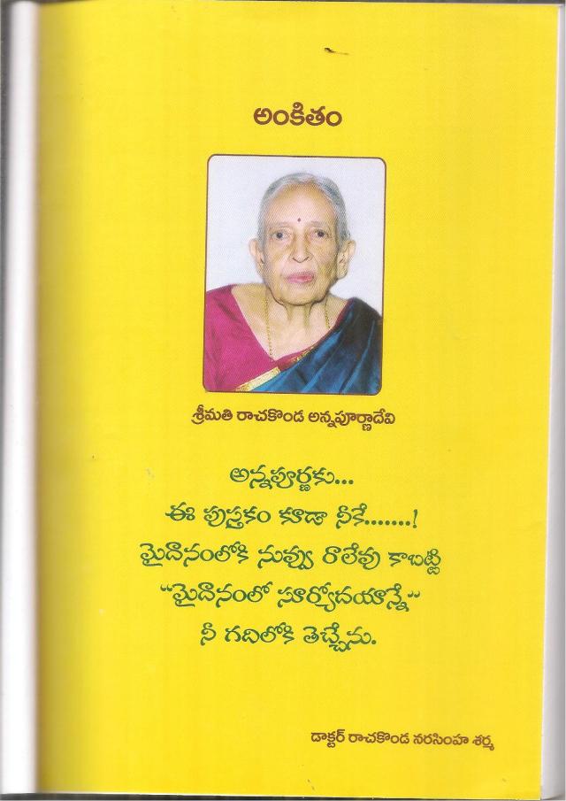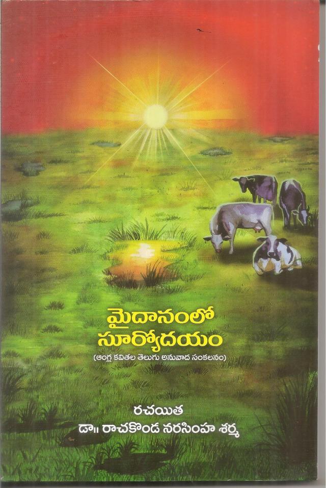 ‘’పంచనవతి వర్ష’’(95) యౌవనులు డా రాచకొండ నరసింహ శర్మగారు తమకున్న ఆంగ్లకవితాభిరుచికి దర్పణంగా తాను చదువుతున్నకాలంలో తనకు అత్యంత ప్రీతికరమైనఅ ఆంగ్ల కవితలను ఎంచుకొని , మరో ఆంగ్లకవితానువాద సంపుటిని సప్తతి(70) కవితల అనువాదంతో ఈ సెప్టెంబర్ లో ‘’మైదానం లో సూర్యోదయం ‘’గా వెలువరించారు .ఆంగ్ల కవిత్వం చదివితే ‘’చిత్తము నిలవదు సుంత యైన ‘’అన్నట్లు ఆయన అనుభవించి ఆ ఆన౦దానుభూతిని మనకూ పంచిపెట్టే హృదయమున్న భిషగ్వరులాయన .ఇప్పటికే ‘’పడమటి సంధ్యారాగం ‘’లో 41,’’అయితే ‘’లో 46ఆంగ్లకవితల్ని అనువదించి ,స్మైల్స్ ,టియర్స్ అండ్ మోర్’’ ఆంగ్లకవితల ను ,’’సానెట్స్ ఫ్రం పోర్చుగీస్’’ అందించిన అనుభవం వారిది .తెలుగు కవితలను ఆంగ్లంలోకీ అనువాదం చేసిన నేర్పు వారిది .అంటే ద్విభాషా కవి .ఈ పుస్తకాన్ని తమప్రియతమ అర్ధాంగి డా .అన్నపూర్ణా దేవికి ,ఆమె మైదానం లోకి రాలేనందున ఆమెగదిలోకే ‘’మైదానం లో సూర్యోదయం ‘’తెచ్చి పరమానంద భరితురాలిని చేసి ,తమ సతీ ప్రేమను వర్షించారు .పుస్తక శీర్షికకు తగిన మైదానం ,సూర్యోదయం ,పశువులు, నీటి చెలమ ,పచ్చ గడ్డిలతో ముఖ చిత్రం ముద్దులొలికింది .ఆంగ్లకవితలు పేజీకి ఎడమవైపు ,తెలుగు సేత కుడివైపు ,అనుబంధంగా ఆకవుల చరిత్ర సంక్షిప్తంగా అందించారు .దాదాపు స్కాలిత్యం లేని పెద్ద అక్షరాలతో.పుస్తకం చూడగానే మైదానం అంటే ‘’ఫ్లాటై ‘’పోతాం .శర్మగారు ఆత్మీయంగా పంపిన ఈపుస్తకం నిన్న మధ్యాహ్నం నాకు అందింది .రాత్రి 20,ఈ రోజు ఉదయం మిగిలిన 50 ఆబగా జుర్రేశాను .నిన్న పుస్తకం ఒక సారి తిరగేసి ‘’టైటిల్ ‘’విషయం లో ముందుమాటలు రాసినవారు ఎవరైనా మార్గ దర్శనం చేశారేమో అని వెతికితే దొరకలేదు .శార్మగారికే ఫోన్ చేసి పుస్తకం అందిన సంగతిచెప్పి ,శీర్షిక ఔచిత్యాన్ని గురించి అడిగాను .వారు చెప్పిన సమాధానం సంతృప్తి కలిగించింది .ఈ కవుల జననకాలం 1554నుంచి 1896వరకు .అంటే దాదాపు 350సంవత్సరాల కాలవ్యవధిలోని కవులు, వారికవిత్వ దర్శనం అన్నమాట .కనుక అద్భుతమైన వైవిధ్యం ,ఆలోచనలలో పరిపక్వత ,అనుభవసారం ఉన్నకవితలు .ఈ కవులు రాజకవులు ,కవిరాజులు ,రాజాస్థాననకవులు అనే పొయెట్ లారియట్స్ , జన హృదయసామ్రాజ్యాన్ని గెలిచినవారు.భగవదన్వేషకులు ,మాటలతోకాక చేతలతో మంచి చేయమని బోధించే తత్వ వేత్తలు ,జర్నలిస్ట్ లు ,సైంటిస్ట్ లు ,నవలా, కథా రచనలలోఅరితేరినవారు,వివిధ దేశాలకు చెందినవారు,’’ఆకాశంలో సగభాగమైన ‘’స్త్రీలు కూడా ఉన్నారు .ఒకరకంగా’’ డెబ్భై మనో ప్రపంచ దర్శనం ‘’చేయించారు శర్మగారు ఈపొత్తం లో .ఈ కవుల్లో కొందరు పులిట్జర్ ప్రైజ్ వంటి ప్రఖ్యాత బహుమతులు అందుకొన్నవారే . వివరాలు తెలీని ఒకకవి ,మరో అజ్ఞాతకవి ఇందులో చోటు చేసుకోన్నారుకూడా . ఇక కవితా మైదానంలో సూర్యోదయ దర్శనం చేసి పులకిద్దాం .
