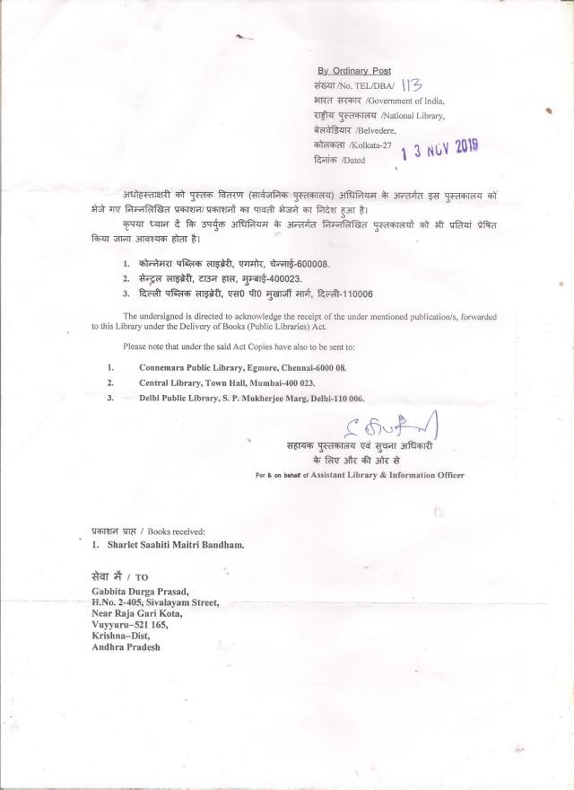 నేను రాసిన ,సరసభారతి ప్రచురించిన ”షార్లెట్ సాహితీ మైత్రీ బంధం ”పుస్తకం దేశం లో ప్రముఖమైన మూడు లైబ్రరీలు 1-కన్నెమెరా లైబ్రరి -చెన్నై 2-సెంట్రల్ లైబ్రరి -ముంబాయ్ 3-ఢిల్లీ పబ్లిక్ లైబ్రరి -ఢిల్లీ లకు అందాయని కొలకత్తా లోని ప్రభుత్వ సంస్థ నేషనల్ లైబరీ వారి నుంచి ఈ రోజు లెటర్ వచ్చిందని తెలియ జేయటానికి సంతోషంగా ఉంది -దుర్గాప్రసాద్ -21-11-19