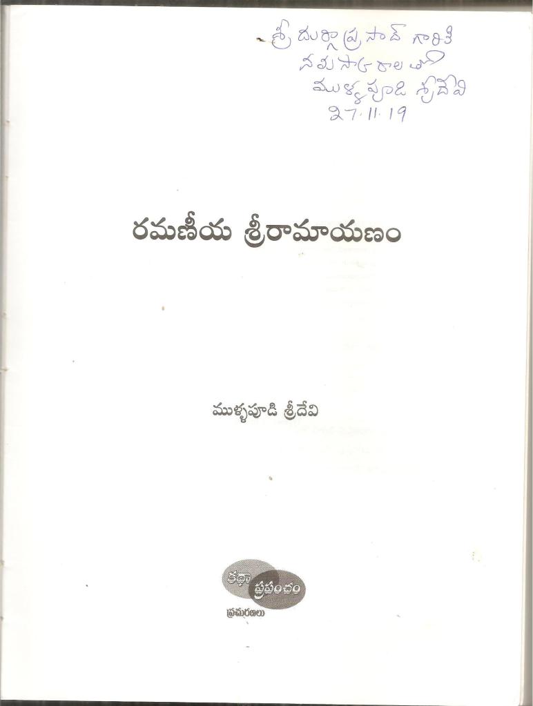 కథా ప్రపంచం అనే తిరుపతి లోని ప్రసిద్ధ సంస్థ ముద్రించిన అందమైన దోషరహితమైన ,పాలనురుగు వంటి తెల్లటికాగితాలపై ముద్రించిన అమూల్యగ్రంథం ఇది .అందమైన శ్రీ సీతారాముల ముఖ చిత్రం , వెనుక ముకుళిత హస్తాలతో రామభక్త హనుమాన్ ఉండటం జయం ,శుభం .సుందరకాండ పారాయణ కు ,రామాయణ పారాయణకు తగినట్లుగా 28అద్యాయాలతో,217పేజీల తో ఉన్న ఈ రమణీయ రామాయణం చదివి అందరూ అందులోని మంచిని గ్రహిస్తే అందరికి క్షేమం ,లాభం విజయం ‘.వాల్మీకి ఉపమానాలకు అద్దం పట్టే రచన శ్రీదేవిగారు చేసి ధన్యులయ్యారు .అభినందనలు .