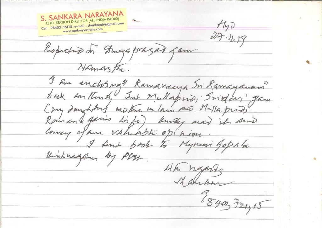 బాపు రమణ లో రమణగారి అర్ధాంగి శ్రీమతి శ్రీదేవి గారు ‘’రమణీయ శ్రీ రామాయణం ‘’రాసి ,ఆత్మీయంగా తనసంతకం చేయగా , వియ్యంకుడు ,బాపుగారితమ్ముడు ,పెన్సిల్ ఆర్ట్ నిపుణులు ,మద్రాస్ రెడియోకేంద్ర మాజీ డైరెక్టర్ ,సరసభారతి ఆత్మీయులు శ్రీ శంకరనారాయణ (శ్రీ సత్తిరాజు శంకరనారాయణ )గారు ,ఆపుస్తకాన్ని తన చేతి వ్రాత ఉత్తరంతో సహా నాకు నవంబర్ 27పంపగా,మర్నాడే అంది,అందిందని ఫోన్ లో ధన్యవాదాలు తెలిపాను .శంకర్ గారి ఉత్తరం లోశ్రీ మైనేని గోపాలకృష్ణగారికి కూడా పుస్తకం పంపినట్లు తెలిపి నన్ను పుస్తకం చదివి అభిప్రాయం తప్పకుండా రాయమని కోరటం వారి సౌజన్యమే .వీరు ఈ నెల 15న బాపు గారి జన్మ దినోత్సవంనాడు ‘’బాపు గారి పురస్కారం ‘’అందుకో కోబోతున్నందుకు హృదయపూర్వక అభినందనలు .నూటికి వెయ్యి శాతం వారు అర్హులు .రమణీయ రామాయణాన్ని మా శ్రీమతి పుస్తకం వచ్చిన దగ్గర్నుంచి ,విడువకుండా పట్టుదలగా ప్రత్యక్షరం చదివి ,మధ్యమధ్యలో’’ ఎంతబాగా రాశారండీ ఆవిడ !’’అంటూ పులకించి నిన్నటితో పూర్తి చేసింది .ఇవాళ మూడుగంటలలో నేనూ ఏకబిగిన చదివాను .స్పందన రాయటానికి ఆశక్తుడనేమో అని సందేహించి ,అయినా శ్రీరామ సంకల్పం గా భావించి మొదలు పెడుతున్నాను .