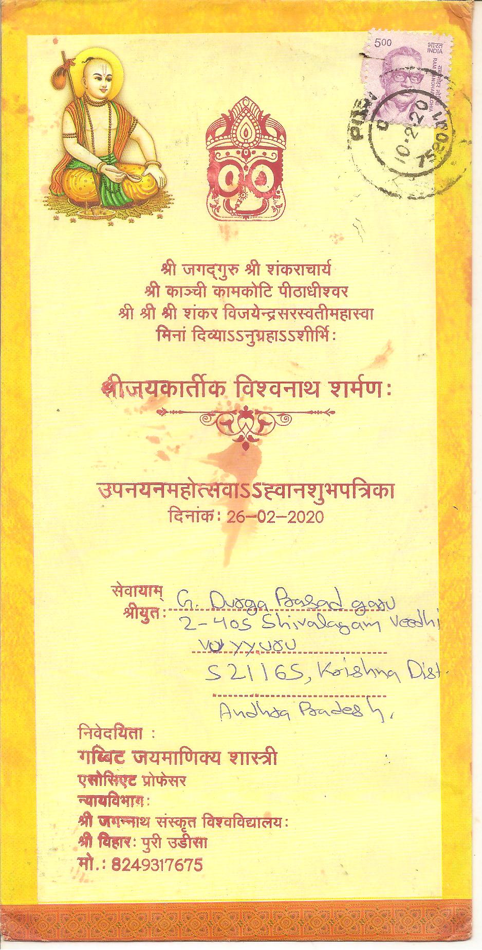← పూరీ లో సంస్కృత ప్రొఫెసర్ డా. గబ్బిట మాణిక్య శాస్త్రి కుమారుని యలమర్రు లో జరిగే ఉపనయన శుభలేఖ