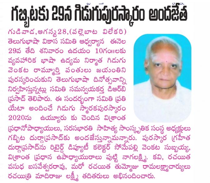 ← గిడుకు పురస్కారం రేపు గిడుగు రామమూర్తి స్మారక పురస్కారం అందజేస్తున్న గుడివాడ తెలుగు భాషా వికాస సమితి