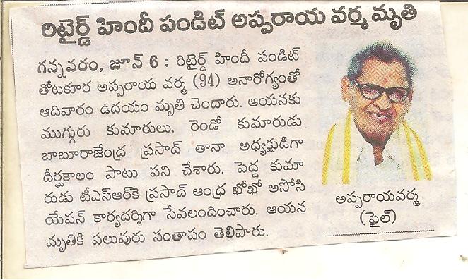 కృష్ణా జిల్లా గిల్డ్ మాజీ అధ్యక్షులు ,కృష్ణా జిల్లా విద్యాభి వృద్ధికి అనేక రంగాలలో సేవలన్దిన్చినవారు ,ప్రతి కార్యకర్తకు ఆత్మీయులు ,మాజీ సీనియర్ హిందీ పండితులు నాకు పరమ ఆప్తులు శ్రీ తోటకూర అప్పారాయ వర్మ*(94)నిన్న6వ తేది స్వగ్రామం గన్నవరం లో మరణించారు వారి ఆత్మకు శాంతి కలగాలని కోరుతూ వారి కుటుంబానికి సాను భూతి తెలియ జేస్తున్నాను -గబ్బిట దుర్గాప్రసాద్ -ఉయ్యూ