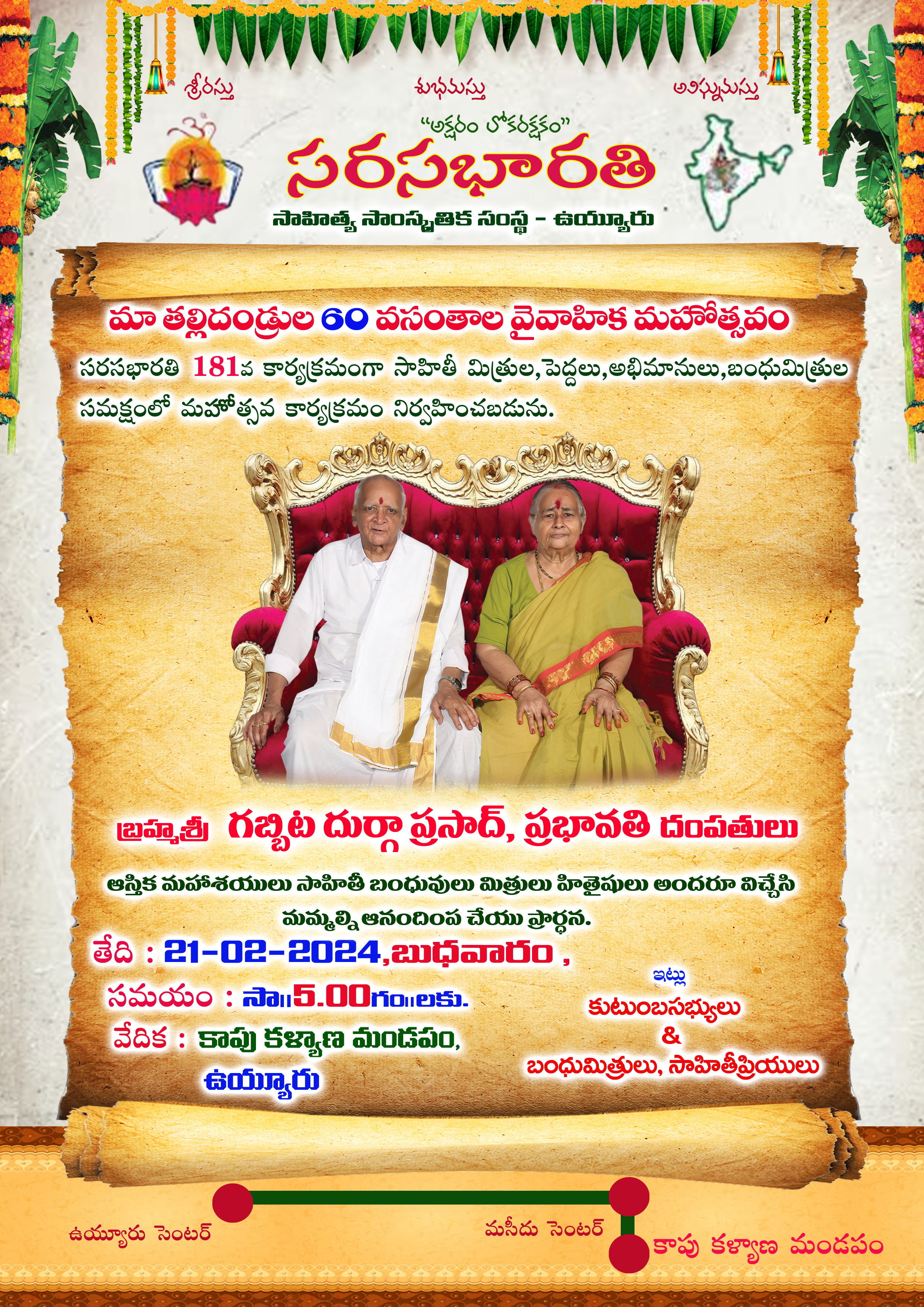 21-2-24 బుధవారం మాఘ శుద్ధ ద్వాదశి ఉదయం6 గం ల నుండి శ్రీ సువర్చలాన్జనేయ స్వామి దీవాలయం లొ ఆలయం పునర్నిర్మించి 36 సంవత్సరాలు పూర్తి అయిన సందర్భంగా జ్యోతిష విద్వాన్ శ్రీ వంగవేటి ఆంజనేయ శాస్త్రి గారి ఆధ్వర్యం లొ ఆలయ అభి వృద్ధి ,స్వామి వారి బిమ్బశుద్ధి కొరకు ,మా దంపతుల వివాహ షష్టి పూర్తి వార్షికోత్సవ సందర్భంగా ప్రత్యెక జపాలు ,మన్యుసూక్తంతో హోమాదులు ,వేదా శీర్వచనం నిర్వహింపబడుతాయి . మా దంపతుల వివాహ షష్టిపూర్తి వార్షికోత్సవం(60సంవత్సరాలు పూర్తి అయిన సందర్భంగా)సరసభారతి 181 వ కార్యక్రమ౦గా 21-2-24 బుధవారం సాయంత్రం నిర్వ హిస్తున్న ప్రత్యేక కార్య క్రమం. యంత్రం మా కుటుంబ సభ్యులు నిర్వహిస్తున్న ప్రత్యేక కార్యక్రమం –ప్రింటెడ్ఇన్విఇన్విటేషన్-ఉయ్యూరు -16-2-24